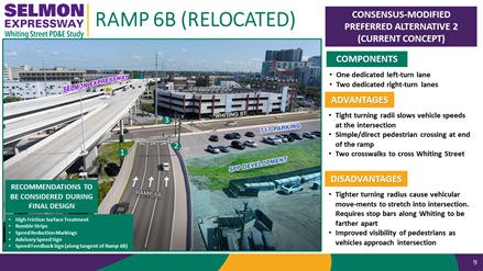 As part of the preferred alternative, the existing ramp for Exit 6B would be moved to the north to connect to Whiting Street instead of Channelside Drive (see Location D). The ramp would begin with 1 lane and end with 3 lanes, 1 for turning westbound (left) and 2 to turn eastbound (right) onto Whiting Street. Moving the ramp for Exit 6B would require two modifications to what is out there today. The beginning of the entrance ramp from Jefferson Street to the eastbound Selmon Expressway would move to the north to make room for moving Exit 6B. And a connection between Nebraska Avenue and Finley Street would be constructed.